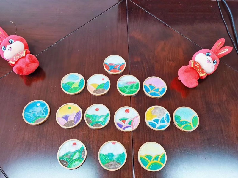 課上,單文靜詳細介紹了掐絲琺瑯彩畫的歷史淵源、發展歷程和工藝流程,并現場教授創作技巧和色彩搭配,培養大家對琺瑯彩畫藝術的審美情趣。在場人員聚精會神地傾聽、觀看,相互討論交流。隨后,在老師的指導下,大家用自己的巧手和智慧,按照“掐絲-洗沙-點彩”的步驟,制作出了一個個極具個性、各具韻味的掐絲琺瑯畫杯墊。