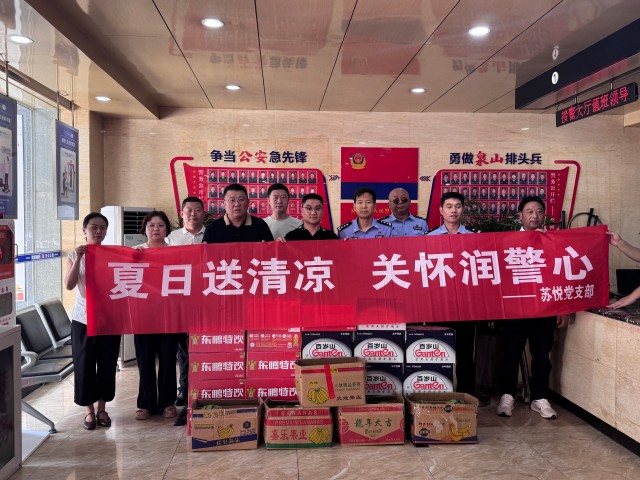 為表達對高溫酷暑中堅守崗位的公安民警的敬意與關懷,深化警企共建情誼,近日,蘇悅黨支部組織黨員代表,前往徐州市公安局泉山分局王陵派出所,開展“夏日送清涼”慰問活動,為奮戰在維護治安、服務群眾第一線的民警送去夏日清涼物資。