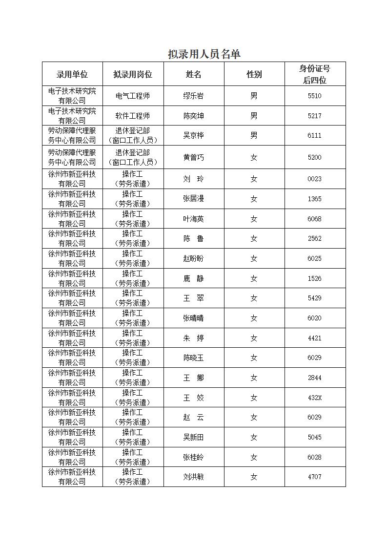 根據《徐州市國有資產投資經營集團有限公司招聘工作人員公告》相關要求,海鷗集團所屬電子技術研究院有限公司、勞動保障代理服務中心有限公司、徐州市新亞科技有限公司公開招聘工作已經完成,現將擬錄用人員名單進行公示。公示期自2023年5月6日起至5月11日止。如對公示對象錄用資格有異議,請于公示期內向海鷗集團組織人事部(紀檢監察室)反映。