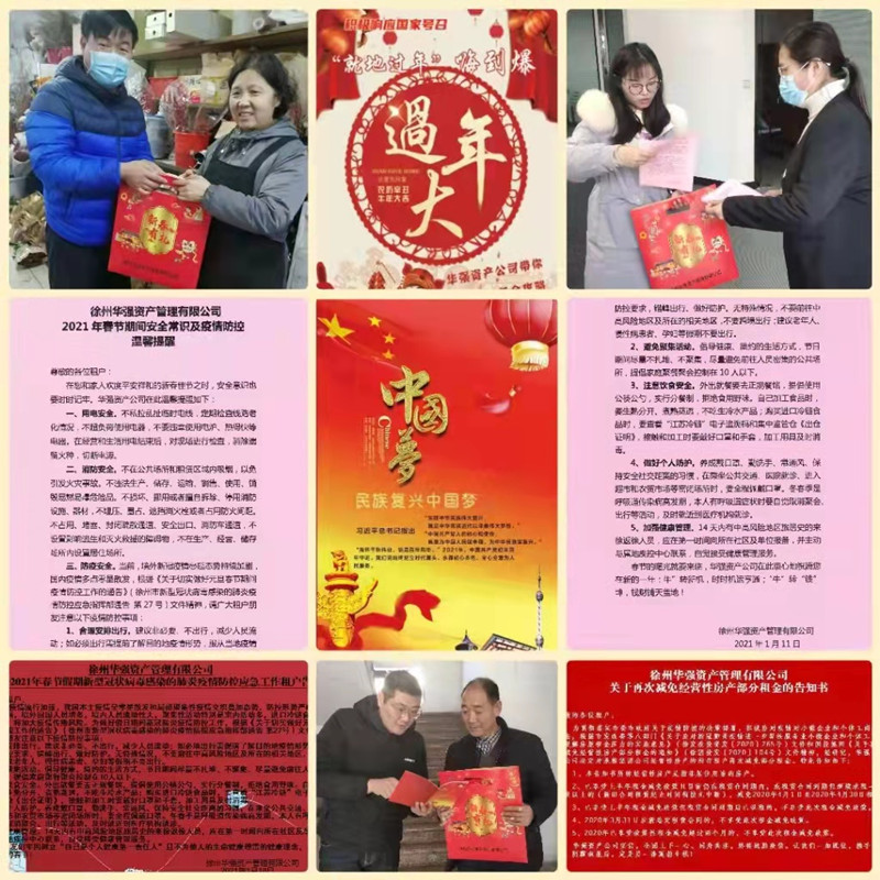 冬夏交替,歲月流轉。即將過去的2020年是眾志成城、全民抗疫的非常之年,也是華強資產公司與全體承租戶共克時艱、共同成長的一年,公司的踏浪前行離不開租戶給予的信任、幫助和寬容。乘著辭舊迎新的東風,在新春佳節來臨之際,為積極響應國家衛健委和徐州市政府“就地過年”行…