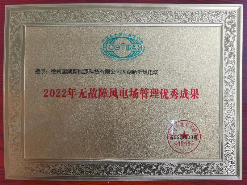 國(guó)湖新沂風(fēng)電場(chǎng)榮獲“2022年無(wú)故障風(fēng)電場(chǎng)管理優(yōu)秀成果”獎(jiǎng)項(xiàng)