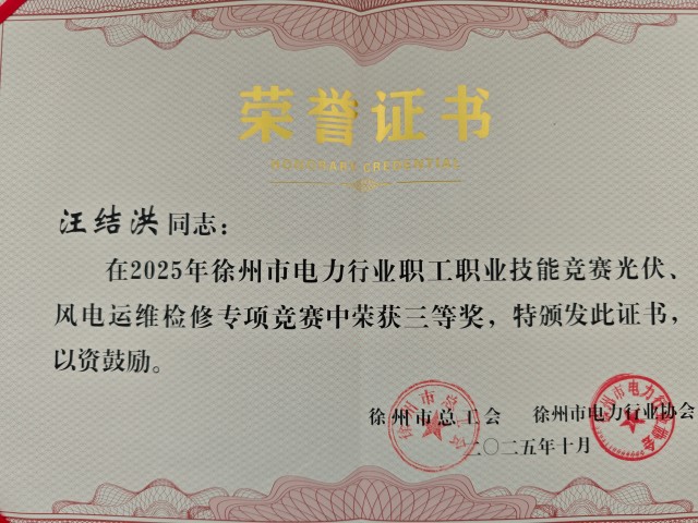 近日,由徐州市總工會和徐州市電力行業(yè)協(xié)會主辦、華潤電力徐州公司承辦的2025年徐州市電力行業(yè)職工職業(yè)技能競賽光伏、風電運維檢修專項競賽圓滿落幕,國爍公司派員參加并喜獲三等獎。本次競賽分為理論和現(xiàn)場實操兩部分,試題涵蓋新能源電站運行維護、設(shè)備檢修和故障處理等全方…