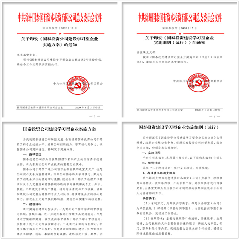 機關及各直屬黨支部作為推進國泰投資建設學習型企業的主推手,充分發揮以“黨建促業務、以業務強黨建”的雙輪驅動模式,廣大黨員干部將作為創建工作的排頭兵,發揮模范帶頭作用。國泰投資公司黨員干部職工是公司賴以生存發展的最寶貴資產,也是公司核心競爭力重要源泉,通過實施創建學習型企業,一是對公司工作中存在的管理能力弱項,查缺補漏,進一步提升各部門管理工具使用能力;二是通過組織實施,在交流共享中培養黨員干部職工綜合管理能力,從根本上提升公司綜合管理水平;三是通過全面的深化學習,拓寬全體黨員干部職工產業視野;四是通過加強團隊建設,努力營造全體職工勤學、創新、奉獻的良好氛圍。最終形成開放、共享、創新的國泰投資企業文化,建設一支專業扎實、作風嚴謹、綜合能力突出,敢于擔當,善于創新,本領過硬的黨員干部職工隊伍。