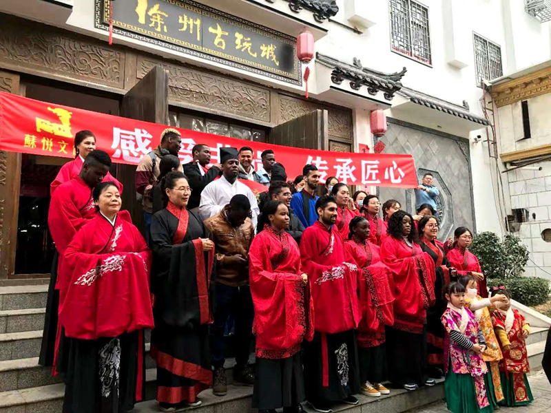 11月15日上午,來自烏茲別克、津巴布韋、巴基斯坦、哈薩克斯坦、馬里、尼泊爾等國家的江蘇師范大學留學生們來到了國投集團蘇悅文化廣場,參加由華強黨總支蘇悅黨支部牽頭舉辦的“感受非遺,傳承匠心”文化推廣活動。國家對留學生的引進制定了完備的教育體系,其中一項就是對中國傳統(tǒng)文化的弘揚,讓留學生走向社會,增強進一步學習和領會中國文化的魅力。留學生們在蘇悅文化公司工作人員的帶領下,穿著各色傳統(tǒng)漢服全面的參觀了徐州古玩城市場。中國漢服非遺研究員李洪蓮、李博老師系統(tǒng)地講解了中國傳統(tǒng)服飾——漢服的歷史和演變,并親自指導留學生們著漢服走秀、行禮,吸引了眾多路人的駐足。