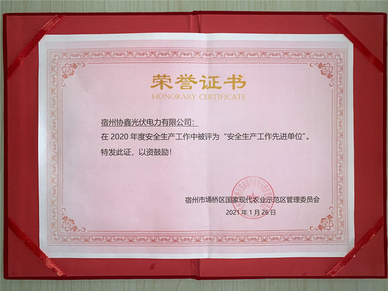 2021年2月1日,在國家現代農業(yè)示范區(qū)管委會召開的年度安全工作會議上,管委會對國投環(huán)能公司所屬宿州協鑫光伏電站2020年度安全生產工作總體情況進行通報,對人員持證上崗、安全目標責任書的落實以及電站各項安全宣貫培訓等工作做出高度評價,授予國投環(huán)能公司所屬宿州協鑫光伏電站2020年度“安全生產工作先進單位”榮譽稱號。