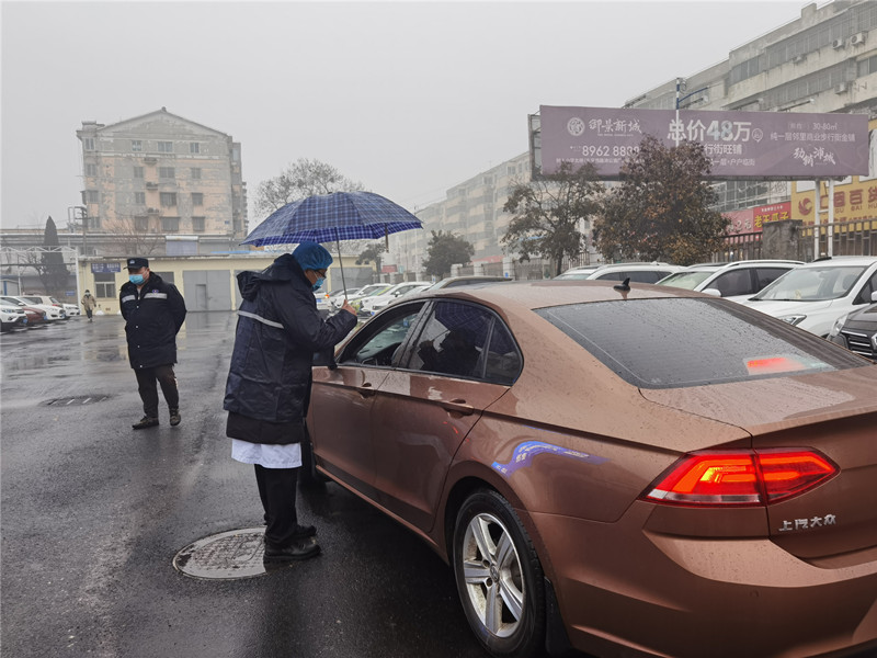 幾位臨床科主任率先垂范,積極參加到預檢分診工作中。內二科朱增武主任,干部內科王光宇、范德龍主任,中醫科張守春主任......他們雖然年紀不輕,平時科室管理、業務十分繁忙,但為支持疫情防控工作,率先站到了防控一線的崗位上,并用一貫認真的工作態度,仔細為每一個進入醫院的患者做好預檢分診。雨中,朱增武主任一手擎著傘,一手拿著測溫儀,在車輛入口為司機進行測溫,只見他身體前傾,把傘靠向開窗接受測溫的司機,寧可自己淋在雨中。58歲的王光宇主任,患有冠心病、高血壓、腰椎鍵盤突出等疾病,但他毫不猶豫地站到了抗疫一線,每天一站就是幾個小時。