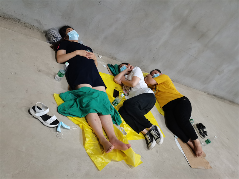 條件的簡陋,為采樣工作增加了難度。在炎熱的環境下,她們穿著密不透風的防護服,帶著N95口罩、面屏和多層手套,不停地為持續不斷到來的居民進行采樣。大到90多歲的老人,小到幾個月的嬰兒,一直戰斗到晚上11點多,在8個小時的時間里,憑著她們麻利地操作和熟練的技術,共為4000人完成了核酸采樣。采樣結束后,有的姐妹累得撐不住了,脫了防護服,顧不得雨天地面的潮濕,直接躺在了生硬的水泥地上。