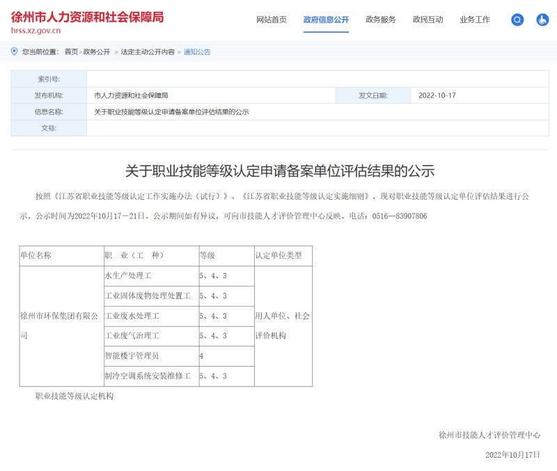 徐州市環(huán)保集團評價中心通過徐州市人力資源和社會保障局審批。按照《江蘇省職業(yè)技能等級認定工作實施辦法(試行)》《江蘇省職業(yè)技能等級認定實施細則》,徐州市環(huán)保集團有限公司成為水生產(chǎn)處理工、工業(yè)固體廢物處理處置工、工業(yè)廢水處理工、工業(yè)廢氣治理工、制冷空調(diào)系統(tǒng)安裝維修工的5、4、3級以及智能樓宇管理員4級的職業(yè)技能等級認定機構(gòu)。