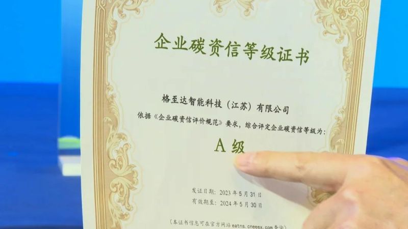 12月8日,在江蘇省新型能源體系示范啟動暨徐州市綠色低碳能源產(chǎn)業(yè)發(fā)展推進(jìn)大會上,江蘇銀行徐州分行、格雷博智能動力、徐州國投集團(tuán)共同簽署了格至達(dá)綠色貸款項(xiàng)目,簽署完走下臺的格至達(dá)智能科技(江蘇)有限公司副總經(jīng)理鄧昇,迫不及待地向記者展示了全市首張企業(yè)碳資信等級證書,“0001A”號!
