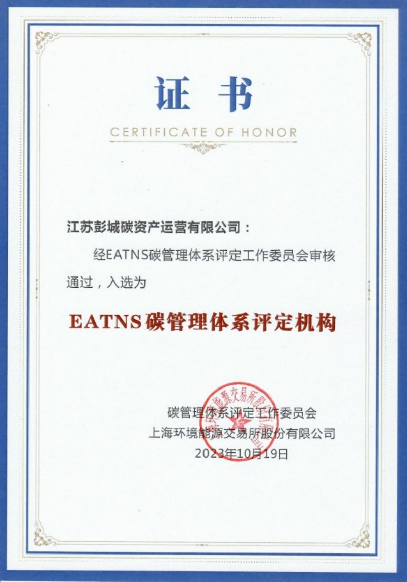 今年10月,江蘇彭城碳資產(chǎn)運(yùn)營有限公司經(jīng)EATNS碳管理體系評定工作委員會審核通過,入選EATNS碳管理體系評定機(jī)構(gòu),這是全國能開展碳資信評價(jià)的九家團(tuán)隊(duì)之一。