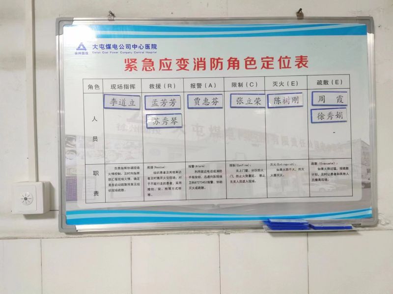 為明確各級崗位人員火災救援分工職責,建立火災快速響應機制,大屯公司中心醫院在學習總結先進工作經驗的基礎上,結合實際情況,設立了“科室火災角色定位分工展示牌”,以明確在班職工的消防角色定位,提高職工的消防滅火和應急疏散能力。