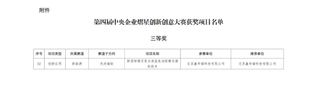 1月3日,國務院國資委發布《關于第四屆中央企業熠星創新創意大賽獲獎名單的通報》,徐州國投集團基金投資先進儲能賽道項目北京鑫華儲科技有限公司獲得三等獎。