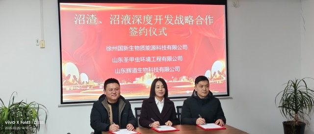 近日,徐州國(guó)新生物質(zhì)能源科技有限公司與山東圣甲蟲(chóng)環(huán)境工程有限公司、山東輝道生物科技有限公司在國(guó)新公司二樓會(huì)議室舉行沼渣、沼液深度開(kāi)發(fā)戰(zhàn)略合作協(xié)議簽約儀式。國(guó)新公司班子成員,圣甲蟲(chóng)公司、輝道公司相關(guān)人員出席活動(dòng)。