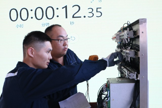 練兵場亦是競技臺。15時30分,高壓開關柜回路故障消缺實操比賽開始。多支參賽隊伍輪番上陣,在裁判嚴格監督下展開較量。面對預設的復雜回路故障,選手們身著統一工裝,佩戴齊整防護,審閱圖紙、測試分析、精準排障。每一次舉手示意操作、每一次工具精準落點,都體現著“安全第一、規范先行”的鐵律。賽場氣氛緊張激烈,選手們沉著冷靜的故障診斷能力與嫻熟的動手能力贏得陣陣贊嘆。
